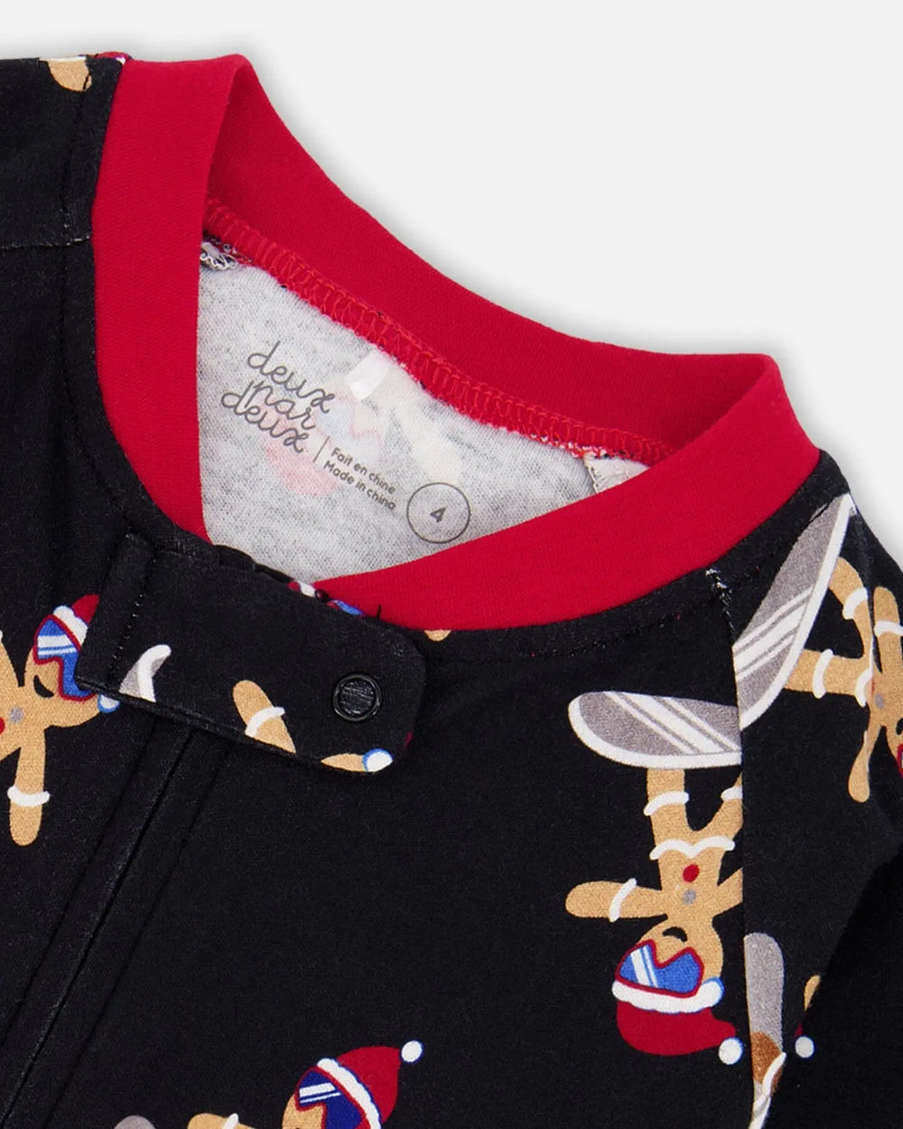 A snowboarding gingerbread man print makes this sleepwear set a perfect choice for the holiday season. With its bold allover cookie print and an asymmetrical closure, this long sleeve one-piece pajama is made from ultra-soft organic cotton interlock that makes it feel like a dream against the skin. Contrast trim at the neck and cuffs add a bold pop of color!
