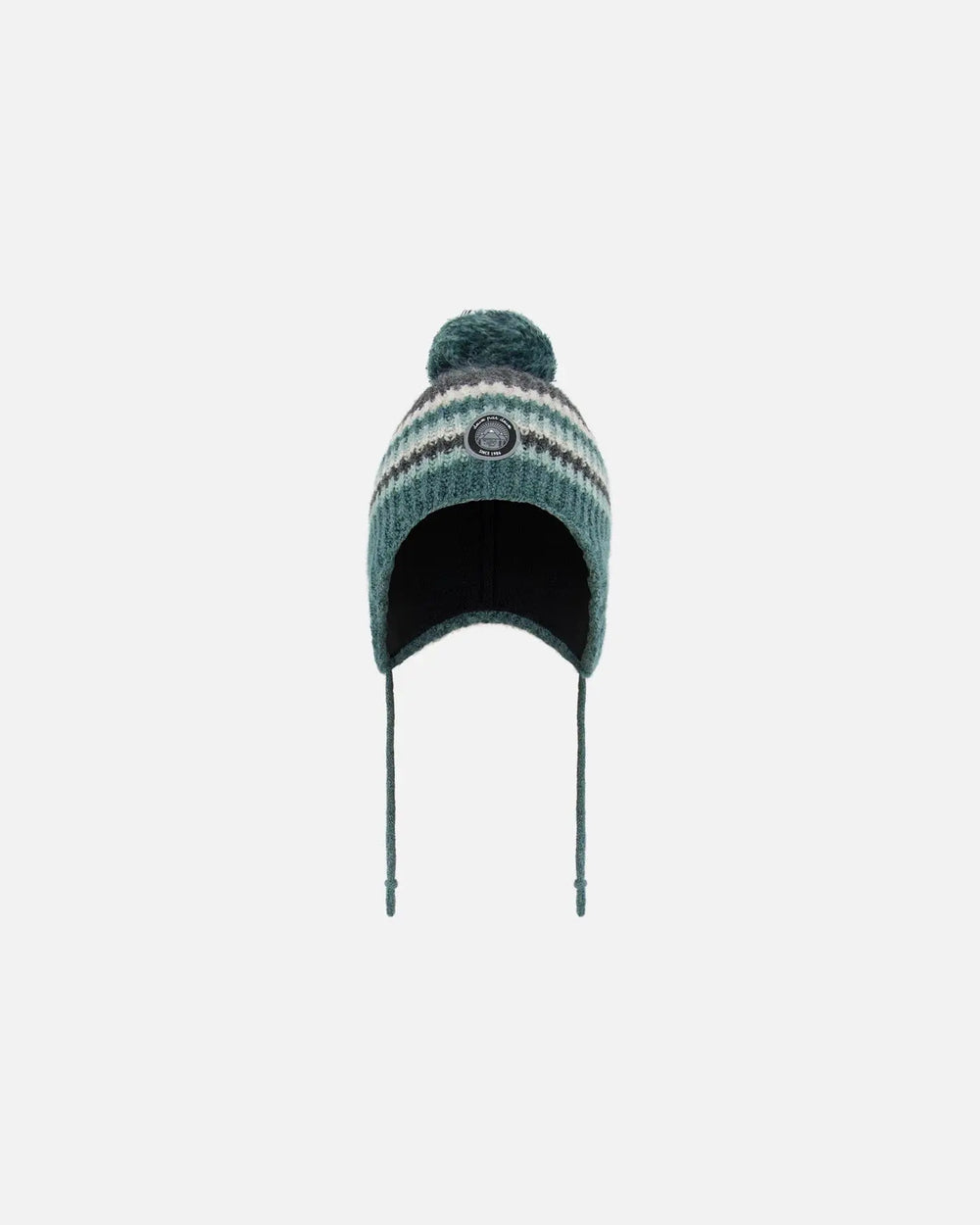With rib knit stitching and horizontal stripes, our Peruvian Knit Hat Gradient Green makes every cold day more stylish! Super soft with a cozy lining, this hat features earflaps for added coverage, side strings, a fluffy pompom, and a logo patch on the front.