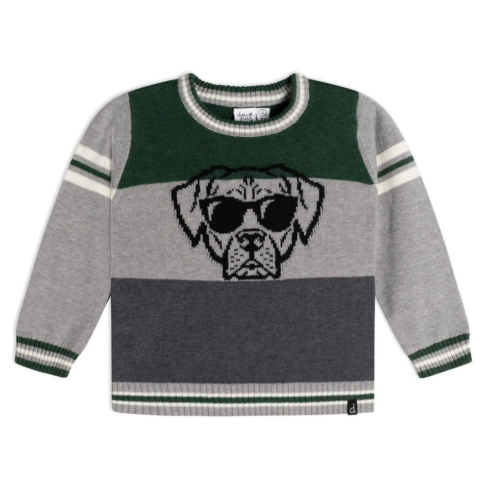 Notre pull en tricot avec imprimé chien offre confort et style décontracté avec une touche unique. Ce pull est fabriqué à partir d'un mélange coton/polyamide/laine et présente une silhouette de pull à manches longues, une encolure ras du cou, des rayures et un chien intarsia portant des lunettes de soleil sur la poitrine.