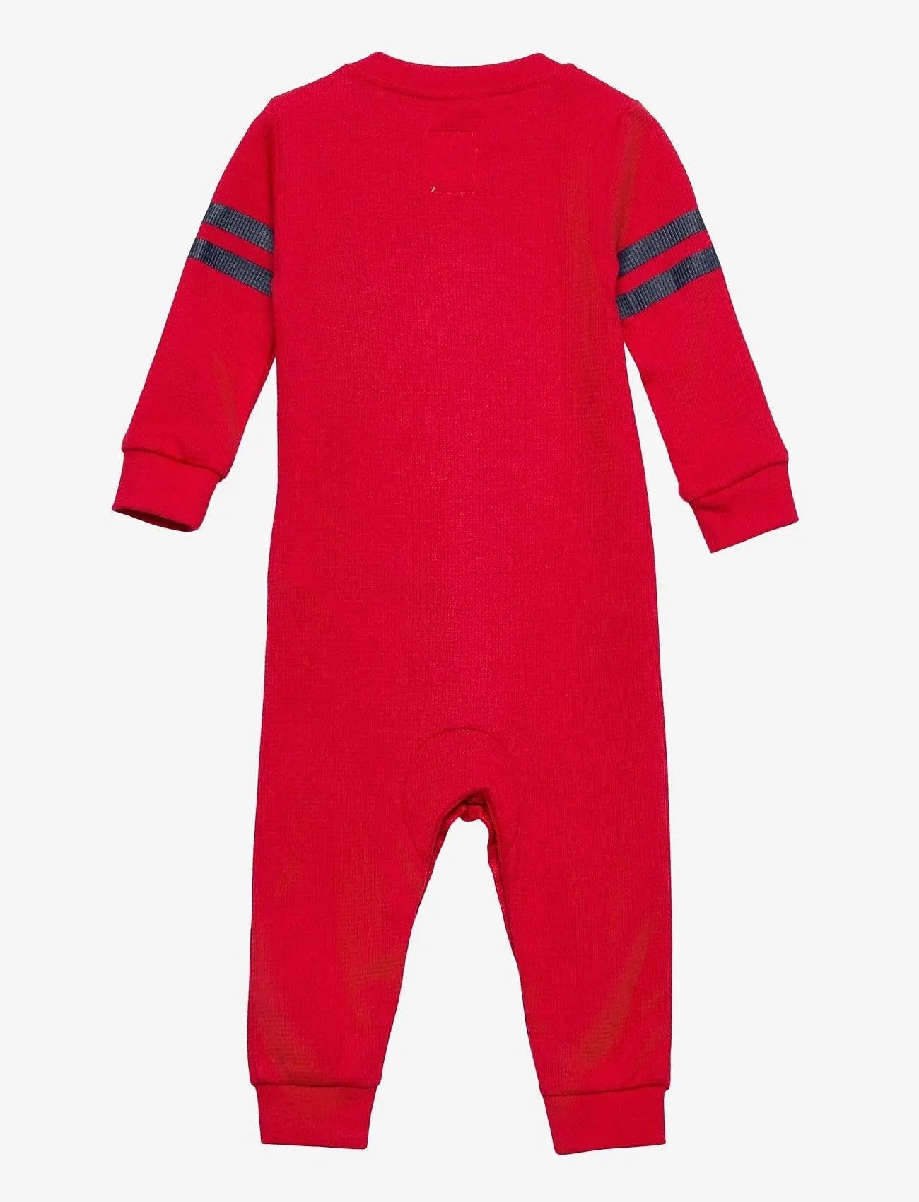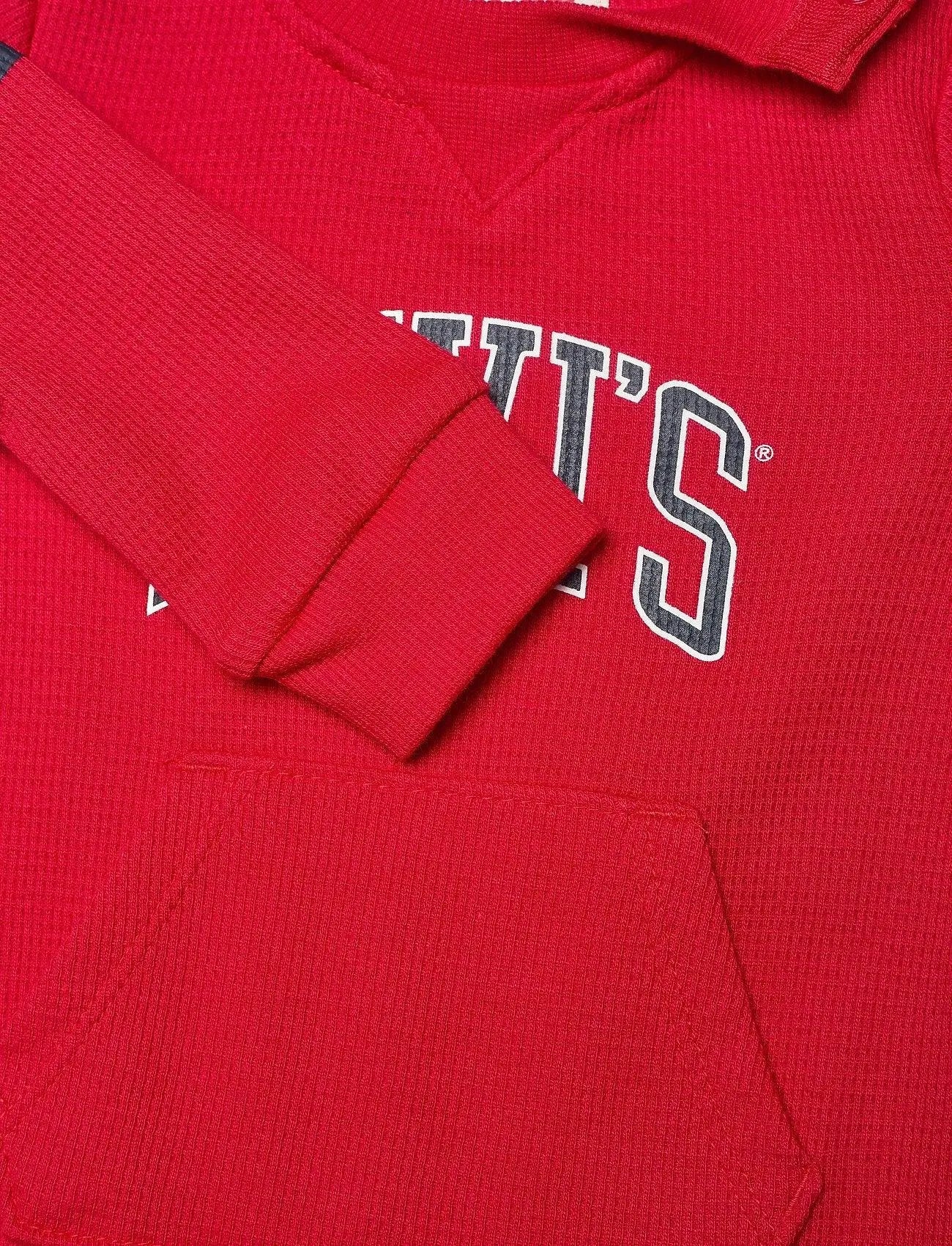 Levis boys waffle thermal bodysuit made to keep your little guy feeling warm and looking cozy. We used a snuggly soft waffle-knit thermal fabric for a feel that’s perfect for sensitive skin. Arched Logo graphic at chest. With long sleeves, kangaroo front pocket, and snap opening in legs for easy diaper change. Machine washable. An essential piece for all day play.