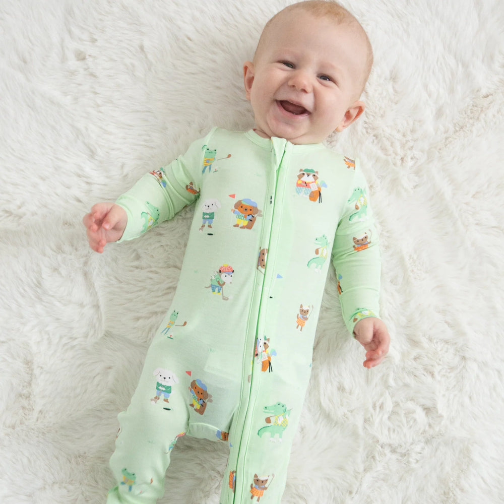 Our Two Way Zipper Footie - Golfing Animal | Angel Dear signature zipper footie makes changing your baby a Snap! (or as we like to say a Zip!) Super soft bamboo fiber fabric and Angel Dear's signature prints will keep the oohs and aahs a- coming.
