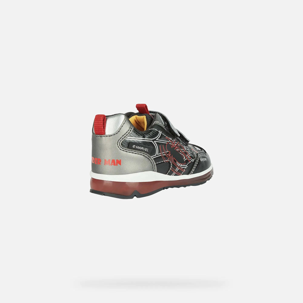 Baby's breathable mid-cut sneaker with a casual design, dedicated to little fans of Spider Man. A product of the partnership between Geox and Marvel, this Todo comes in a black and lead-gray palette with splashes of red. The upper is made from a mix of printed and plain leather-effect material, and the transparent light-up sole brings more fun with every step.