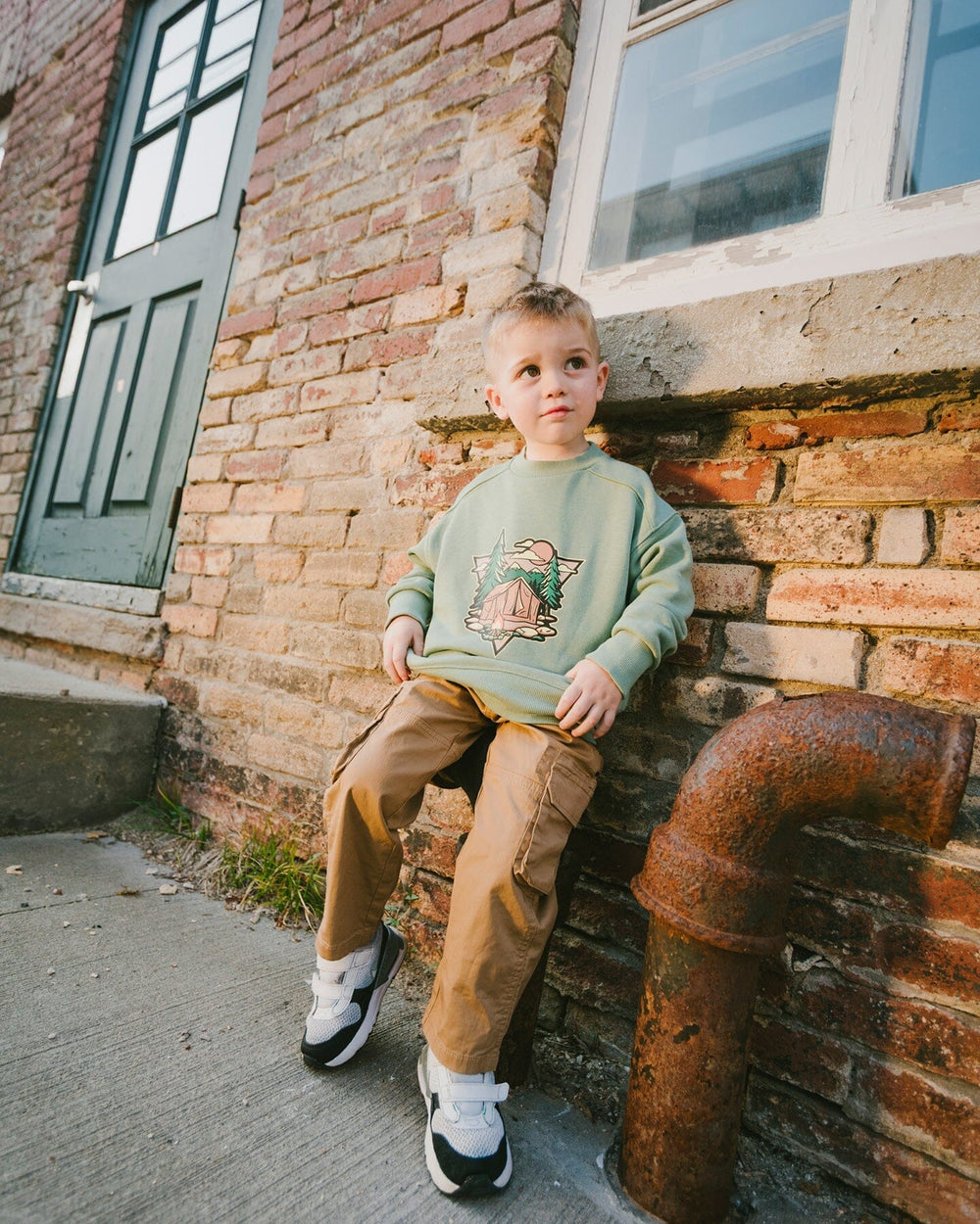 The stretch twill carpenter pants in beige are built for little explorers who love to move. Made from soft stretch twill, these bottoms feature deep slant pockets, functional side cargo pockets with flaps, and a comfortable elastic waistband with drawstring. Designed with reinforced seams at the knee and a straight relaxed leg, these practical pants keeps boys and baby boys ready for every outdoor mission.