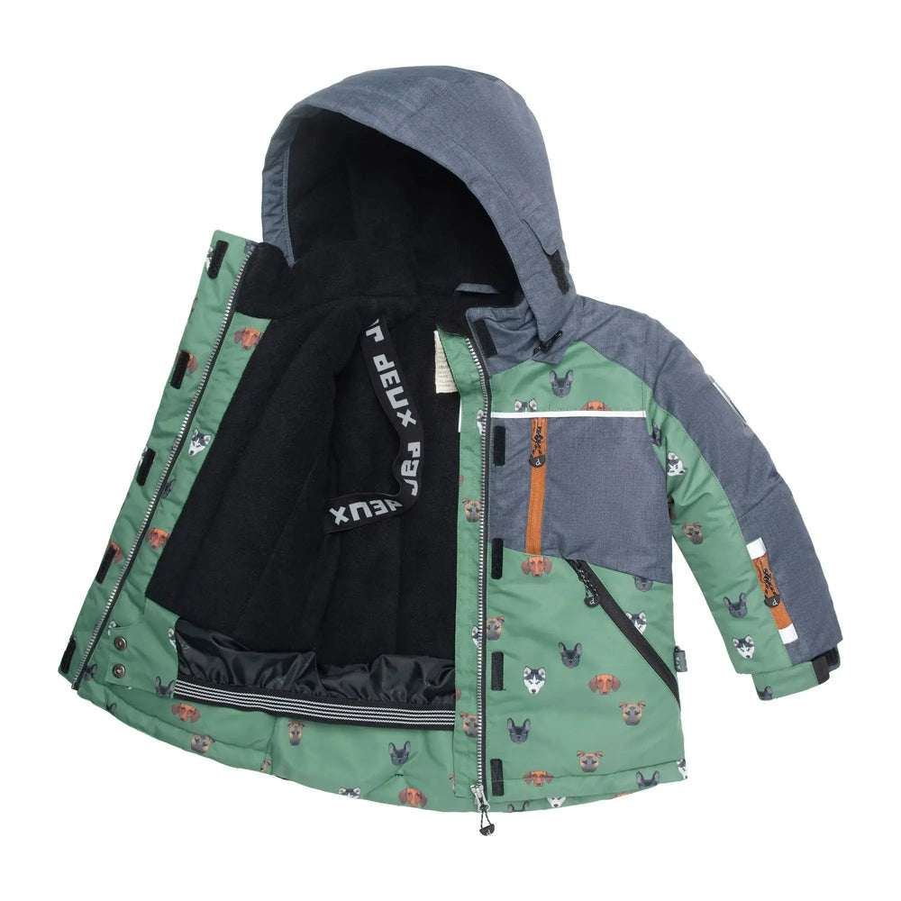 We always buy Deux Par Deux brand because the quality is incredible! The zipper are durable, the material is thick and resilient against the cold, and their products hold up with my active boys putting them to the test. The print on this snowsuit was exactly what we were looking for. My puppy-loving son absolutely adores it!
