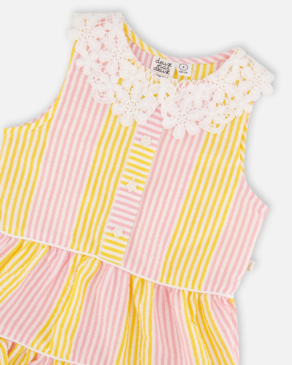 Sleeveless Dress With Crochet Peter Pan Collar Pink And Yellow Stripes