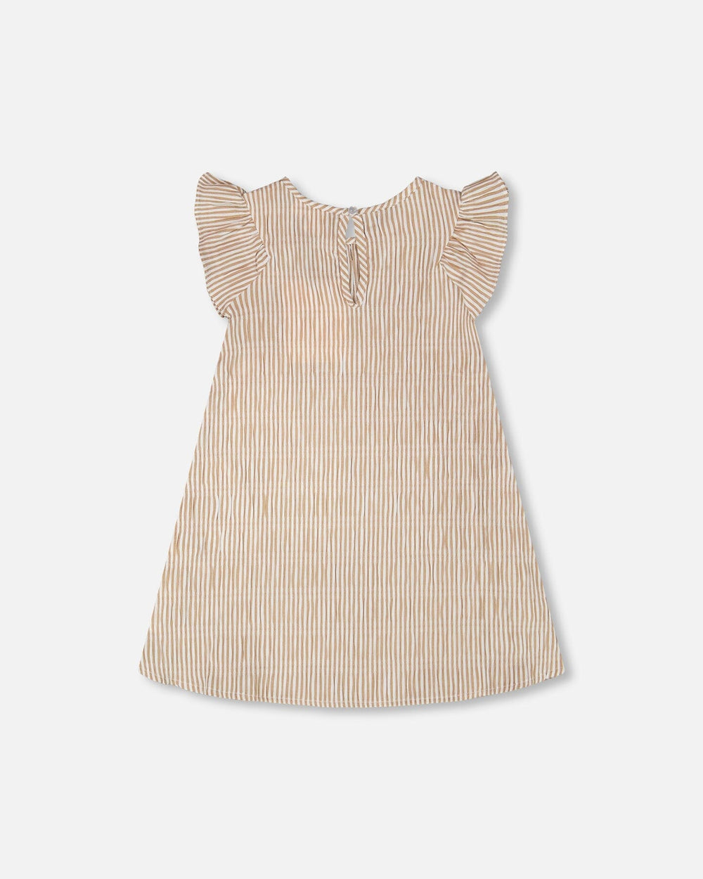 This dress in off white and sand stripes is designed to bring both charm and elegance to festive days. The dress features ruffled cap sleeves, a flared silhouette, and delicate vertical stripes that create a graceful flow. Made from a soft polyester blend with cotton and elastane, it ensures both comfort and style for special occasions.