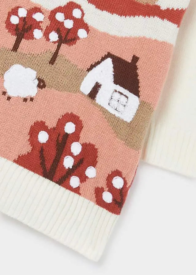 Girls Knit Dress - Berry Vig: Cream basic colored knitted tunic, dress. The front is decorated with a cottage, lambs and trees. Wonderful autumn burgundy and pink shades make it unique.
