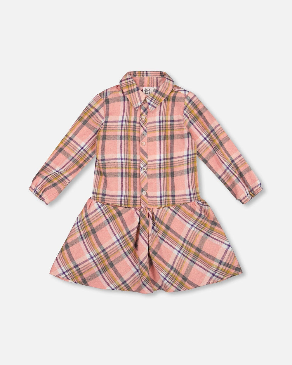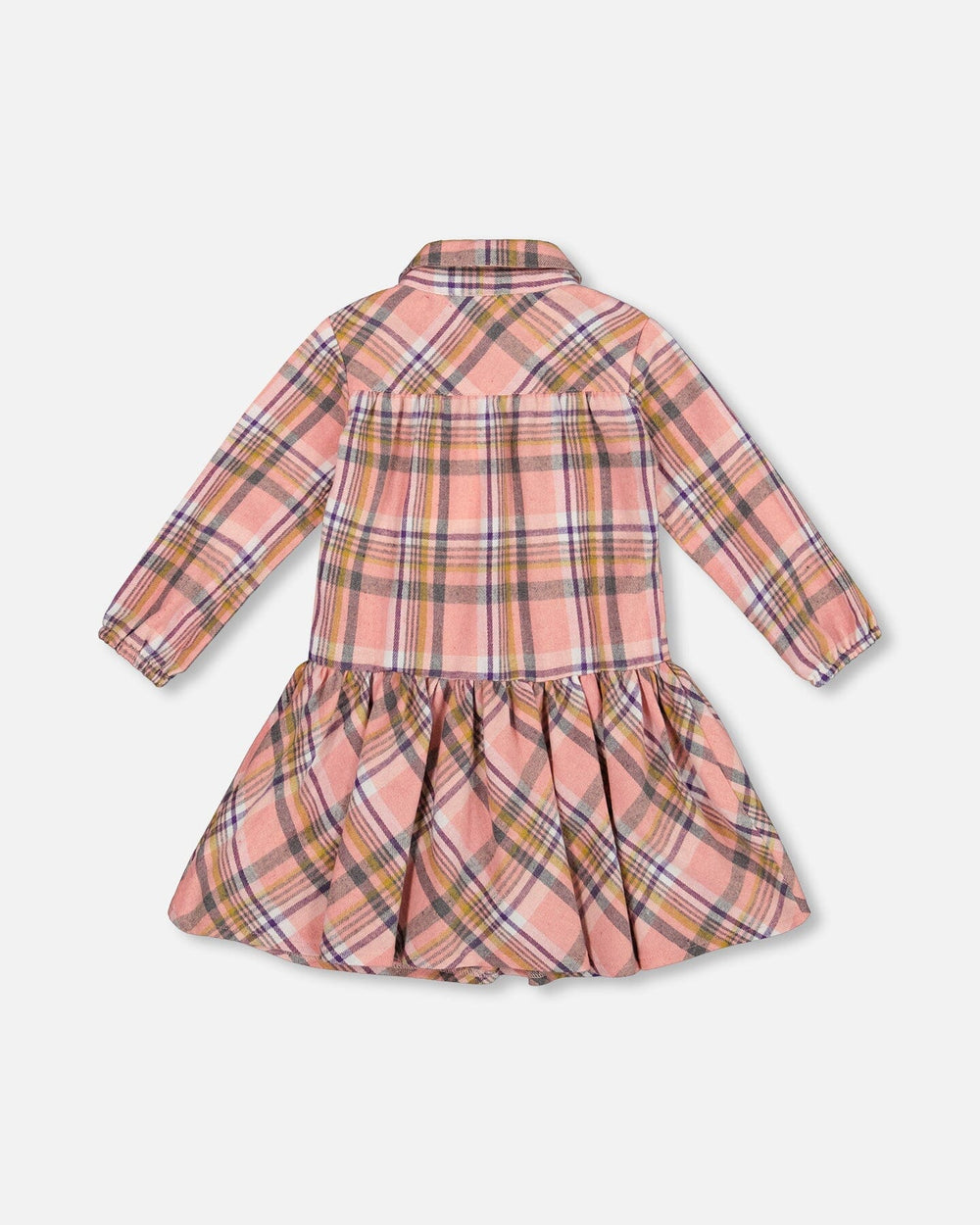 Our Shirt Plaid Dress With Frill Pink, Yellow and Gray blends timeless charm with a playful silhouette. Made from soft 100% cotton flannel, this plaid dress features a pointed collar, front button closure, long sleeves with elastic cuffs, and a drop-waist frill that adds volume to the skirt. Soft and stylish, it’s perfect for girls who love a classic look with a twist.