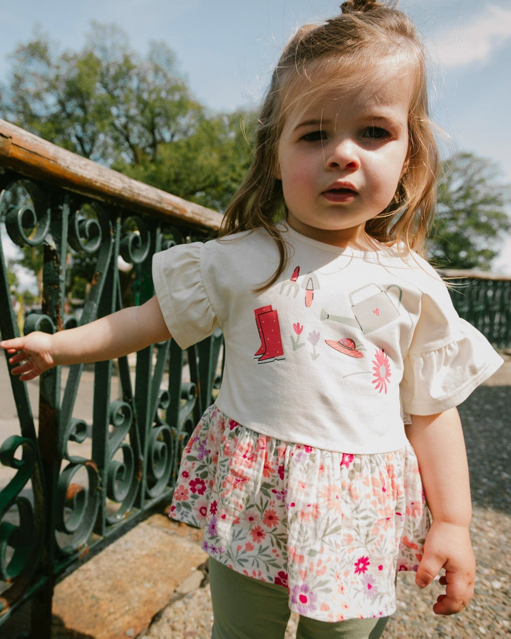 Our organic cotton bi-material tunic beige with flowers print is a charming piece full of playful details. This top features flutter sleeves, a round neckline, and a solid beige jersey top with garden-inspired motifs, contrasted by a flared muslin hem in an allover floral print. Light and comfortable, it’s a perfect choice for girls and baby girls, easy to pair with charming bottoms from our "Little Meadow" collection.