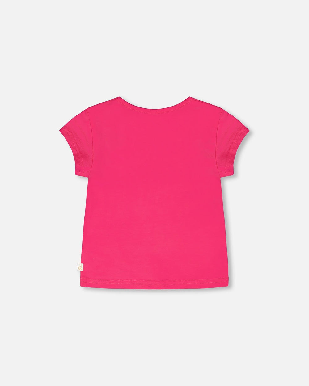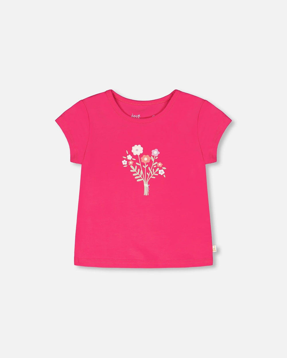 Our organic cotton jersey t-shirt in pink is a sweet everyday essential with a playful twist. This top features short sleeves, a round neckline, and a front floral graphic for extra charm. Soft and stretchy, it’s ideal for girls and baby girls, easy to coordinate with bottoms from our "Little Meadow" collection.