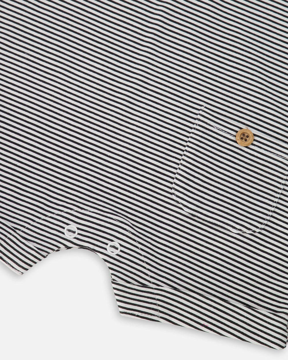 Soft and full of charm, this cotton jersey romper in black and off white stripes is made for adventurous little boys. The one-piece design features short sleeves, a round neckline, a front button placket, and a small patch pocket for a playful yet practical touch. Snaps at the inseam make changes quick and easy, while the soft jersey cotton blend ensures comfort all day long.