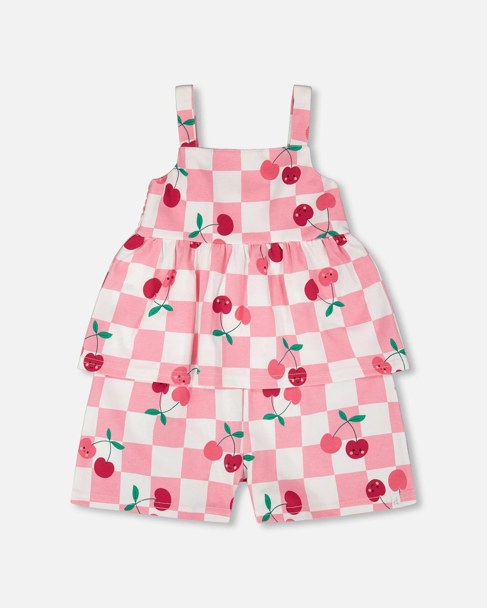 This organic cotton jersey romper in pink with printed cherries is a sweet and playful choice for sunny days. This one-piece features a pink and white check pattern adorned with allover cherries, with slender straps and a flounce overlay for extra charm. Made with soft organic cotton and a hint of stretch, it combines breathable comfort and cheerful style in our “Cherry On The Check” collection.