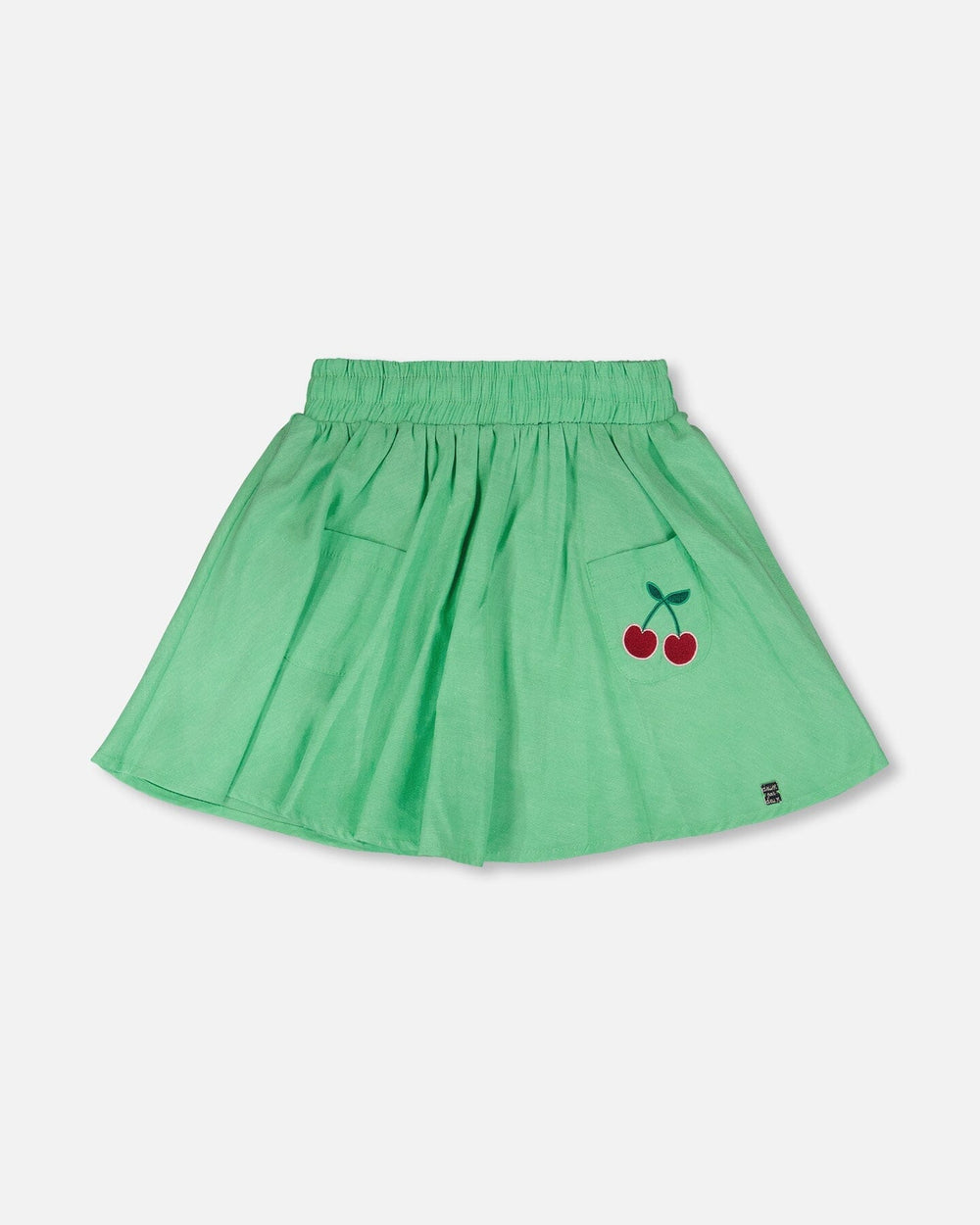 The organic cotton skort with embroidery in green is a playful twist on a classic bottom. These bottoms feature an elastic waist, and a flared silhouette with practical front patch pockets, one of which is embroidered with sweet cherry details. Made from a soft cotton blend with a touch of organic cotton, it’s perfect for twirling while staying comfortable all day.