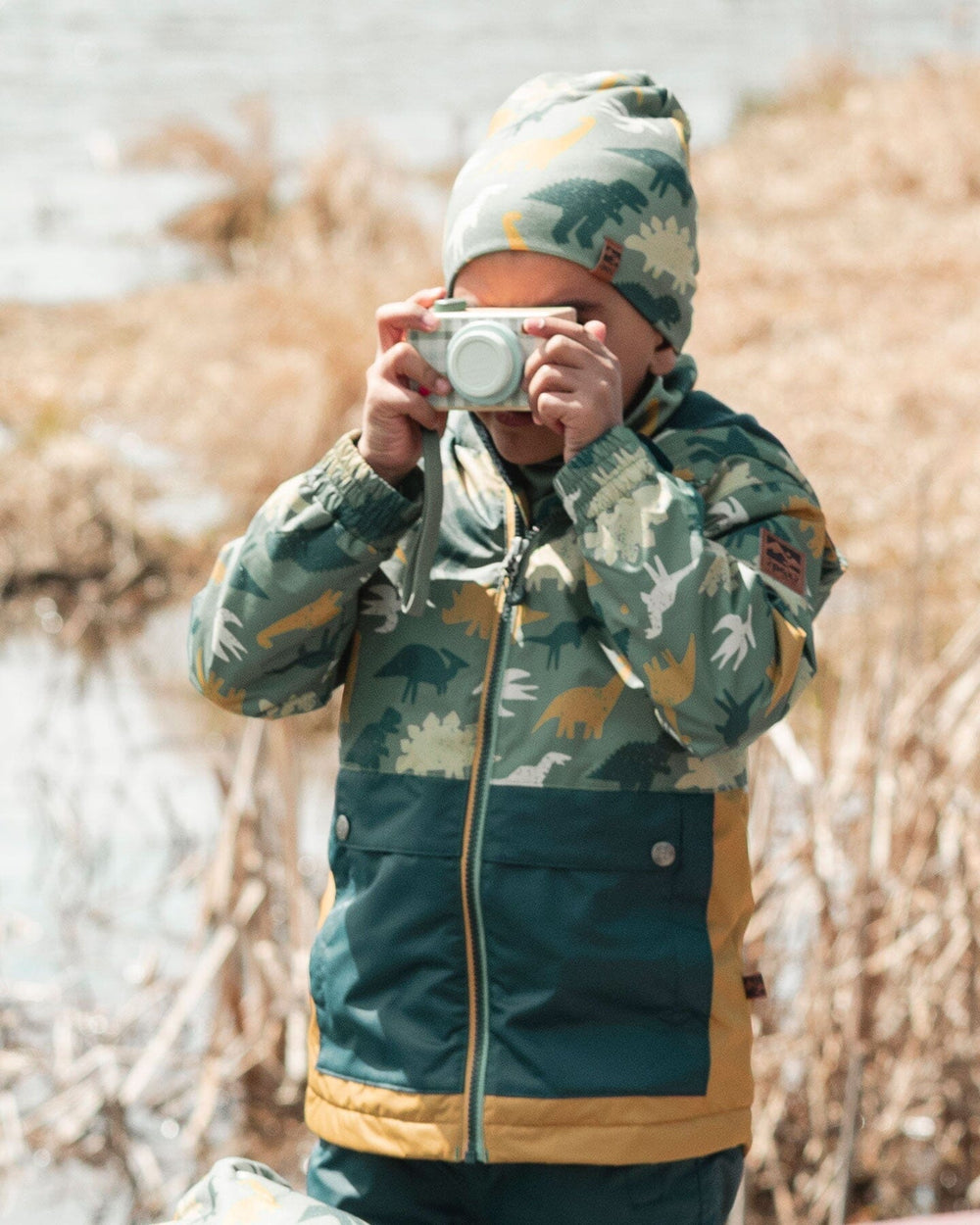 The jersey beanie in green with dinosaur print is a simple yet stylish essential for breezy spring days. Made in a soft stretch blend with a fun allover print, and a signature logo patch at the hem, this lightweight hat hugs the head comfortably while keeping it warm. Part of our “Spring Breeze” collection, it pairs perfectly with other outdoor accessories for kids and babies.