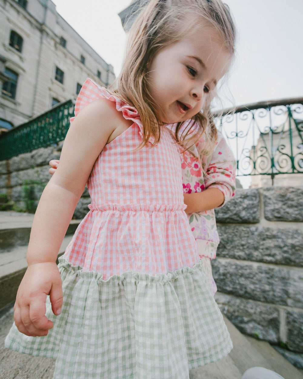 Our tunic and capri set coral gingham and coral is a delightful mix of charm and comfort. The sleeveless A-line tunic features flutter ruffles at the shoulders, and tiered flounces with an allover gingham print in soft coral and green hues. Paired with coral organic cotton capri leggings finished with little ruffles at the hem, this set is perfect for girls and baby girls to enjoy sunny adventures.