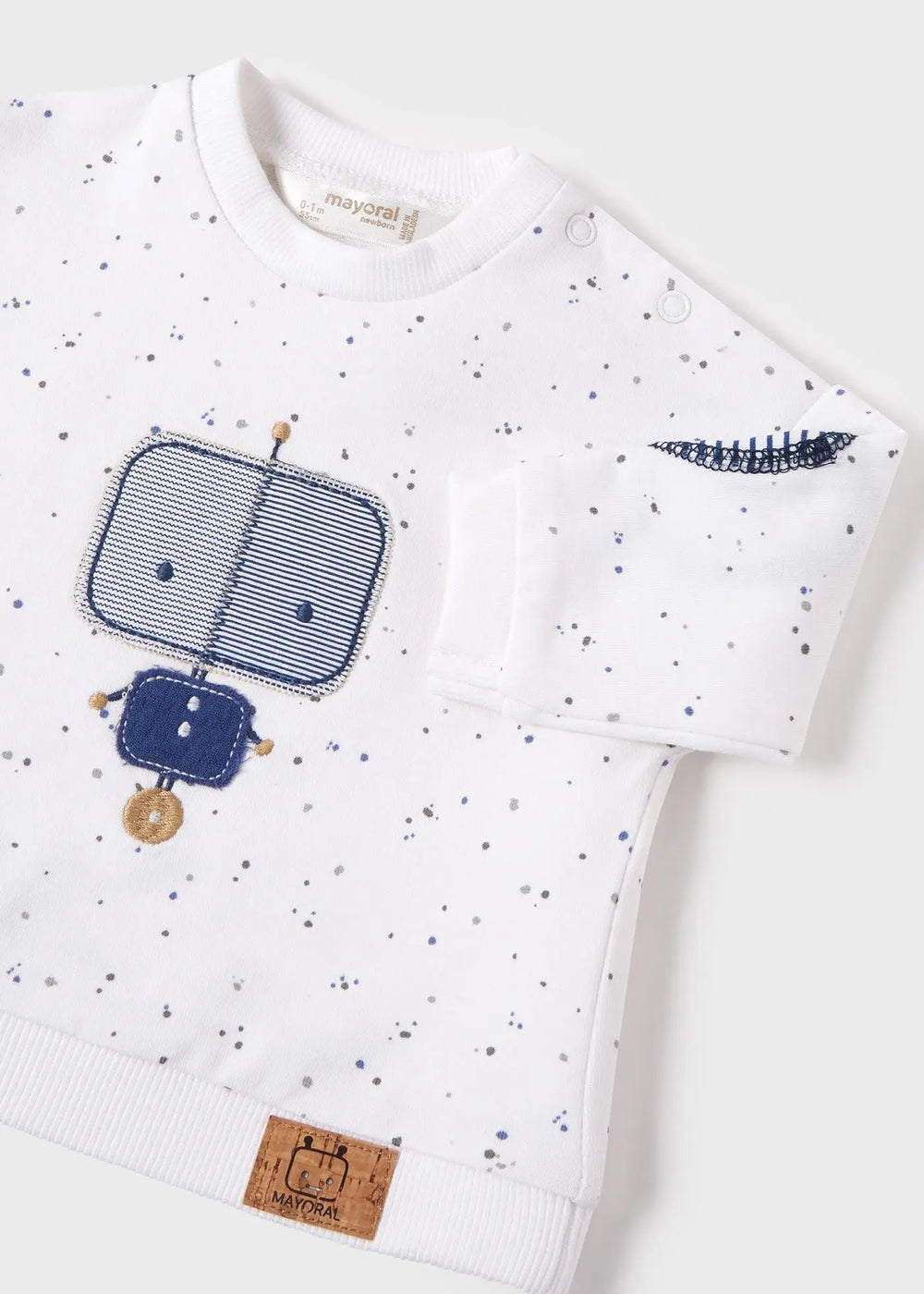 ECOFRIENDS garment 100% organic cotton Long sleeved Sweatshirt for newborn boy. Round neckline. Snap button fastening on the shoulder to allow the garment to be put on easily. Comfortable fleece fabric, soft and smooth to the touch. Decorative elements: decorative appliques, design with elbow patches