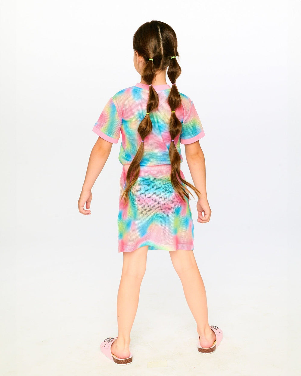 The multicolor mesh beach dress is a playful cover-up for sunny days by the sea. Designed with short sleeves, an allover multicolor pattern, and a comfortable crew neckline, this beach layer features an elastic waist with a drawstring for an adjustable fit. Lightweight and breathable, this piece adds a pop of color on top of any swimsuit.